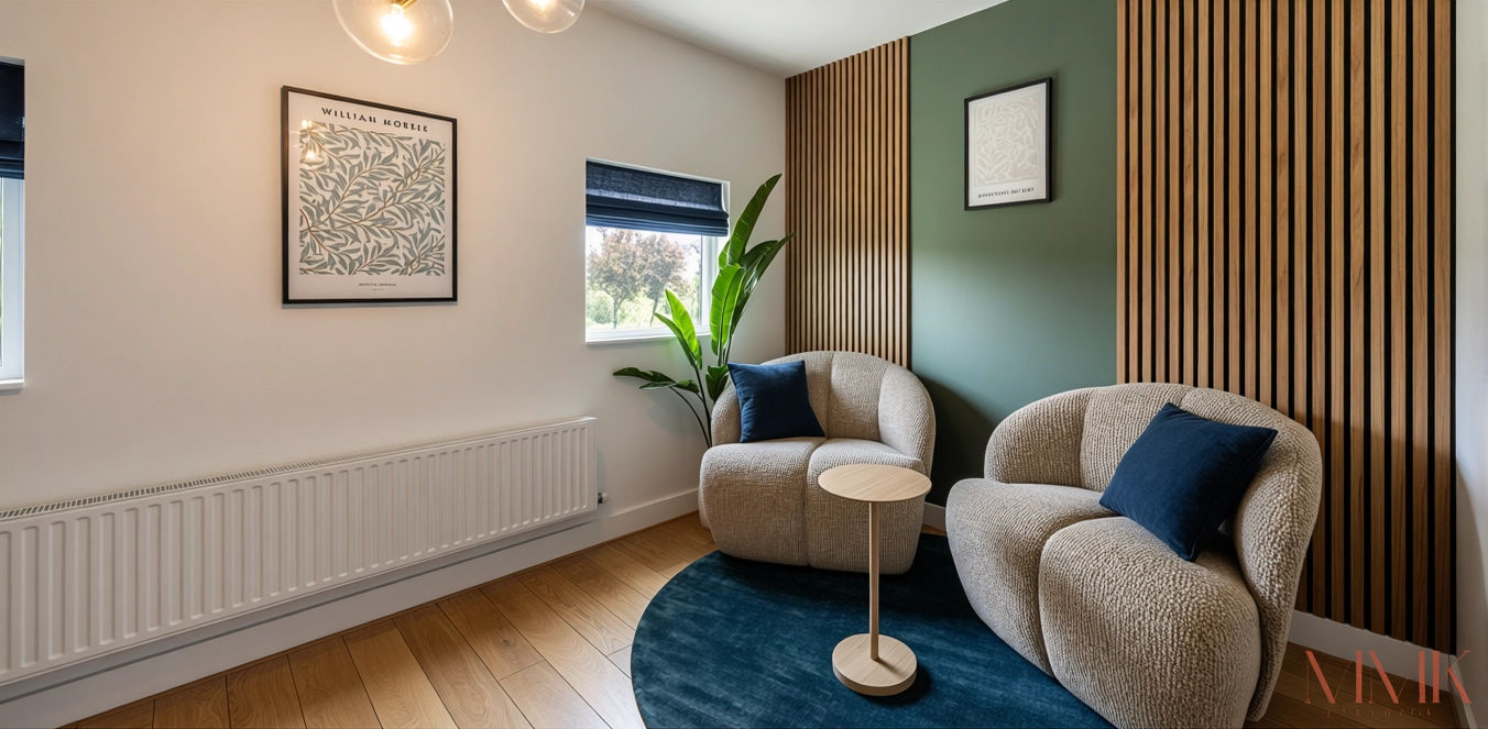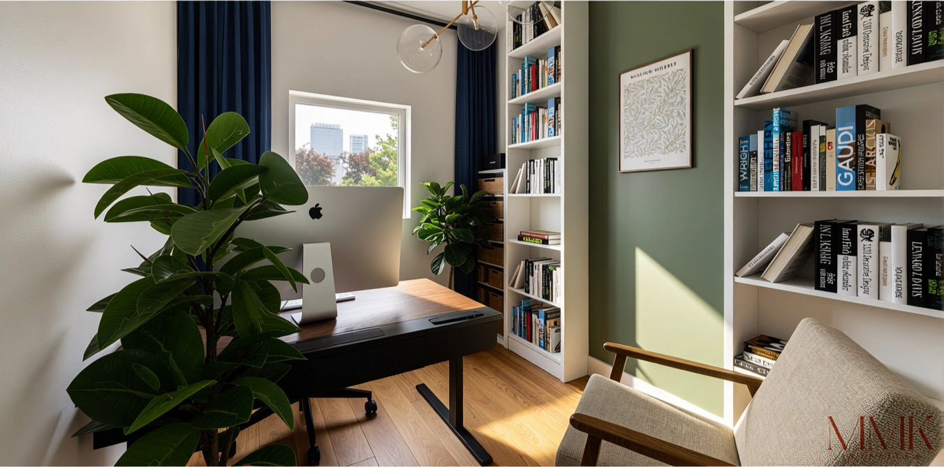 Voor dit project heb ik een kantoor getransformeerd tot een stoere en inspirerende mannen werkplek, in de kleuren van het bedrijf: blauw en groen.